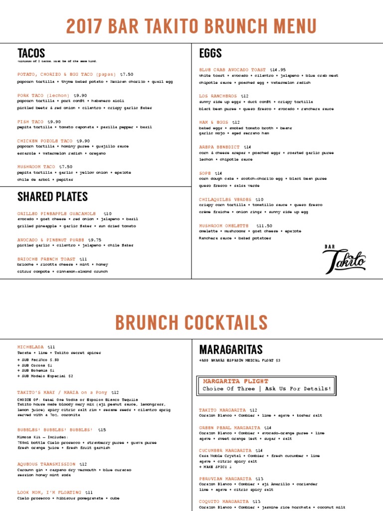 Bar Takito Brunch Menu PDF North American Cuisine Mexican Cuisine